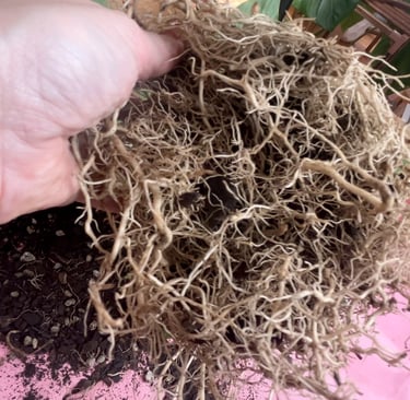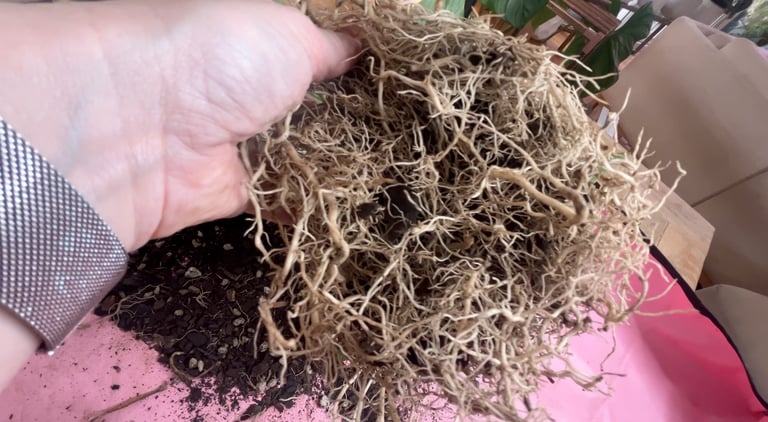 Barely any soil left, roots everywhere, but here's the interesting part - hardly any roots coming out the bottom holes. Usually, healthy root-bound plants send roots through the drainage holes, but not here. She was cramped AND unhealthy.