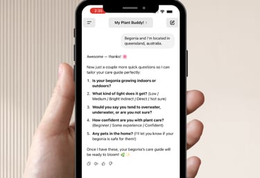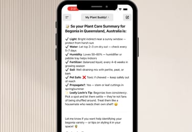 In seconds, you'll get custom, easy-to-follow instructions for watering, feeding, and placement—based on your setup. No more second guessing. No more generic tips.