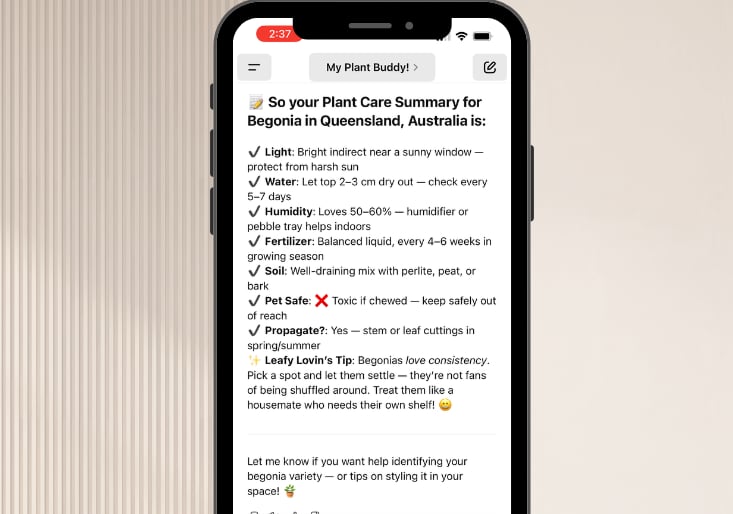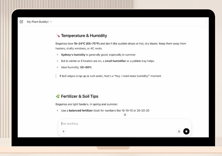 My Plant Buddy uses your light, humidity, and even your confidence level to tailor its advice. It’s not just smart—it’s smart for you.